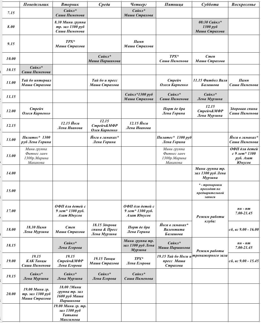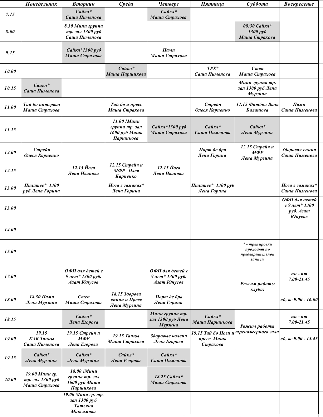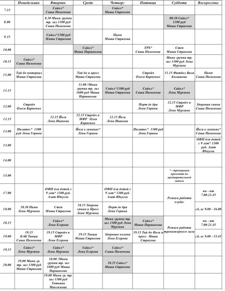* – тренировки проходят по предварительной записи
